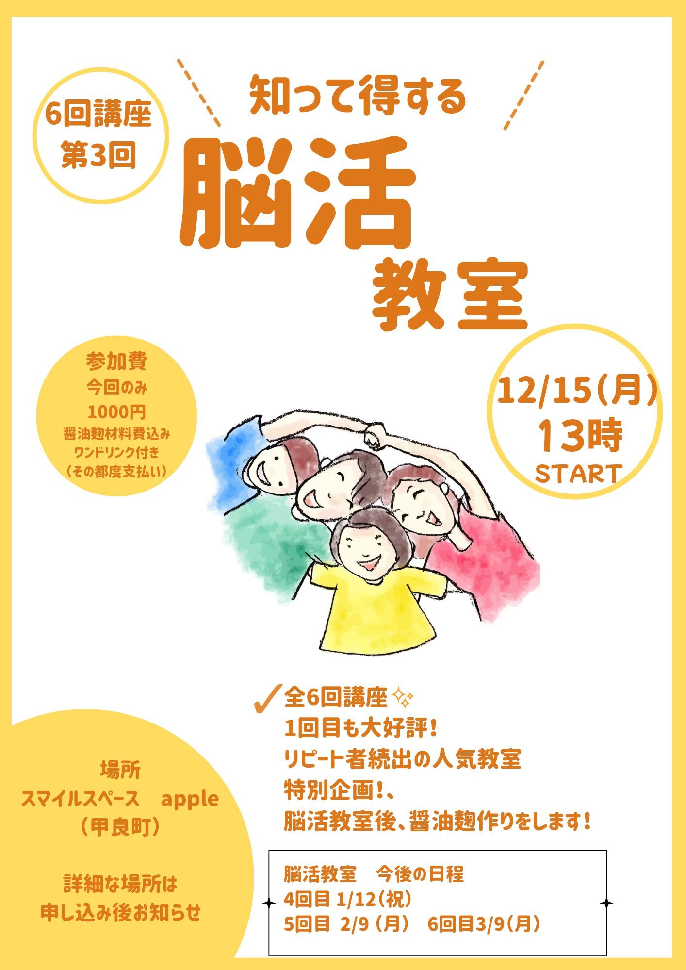2025.12.08 認知症予防教室 スマイルスペース apple 様 滋賀県犬上郡甲良町にある「スマイルスペース apple」さんへ、全6回の連続講座、脳活教室の2回目に参加してきました。 本日は「認知症の種類」をテーマにミニ講座をさせて頂き、参加して頂いた皆さんと対話をしながら、認知症の理解を進めて行きました。その後、記憶力のトレーニングを一緒にさせて頂きました。笑顔の多い雰囲気の中で講座をさせて頂き、ありがとうございました。 PDFを開く 一覧に戻る