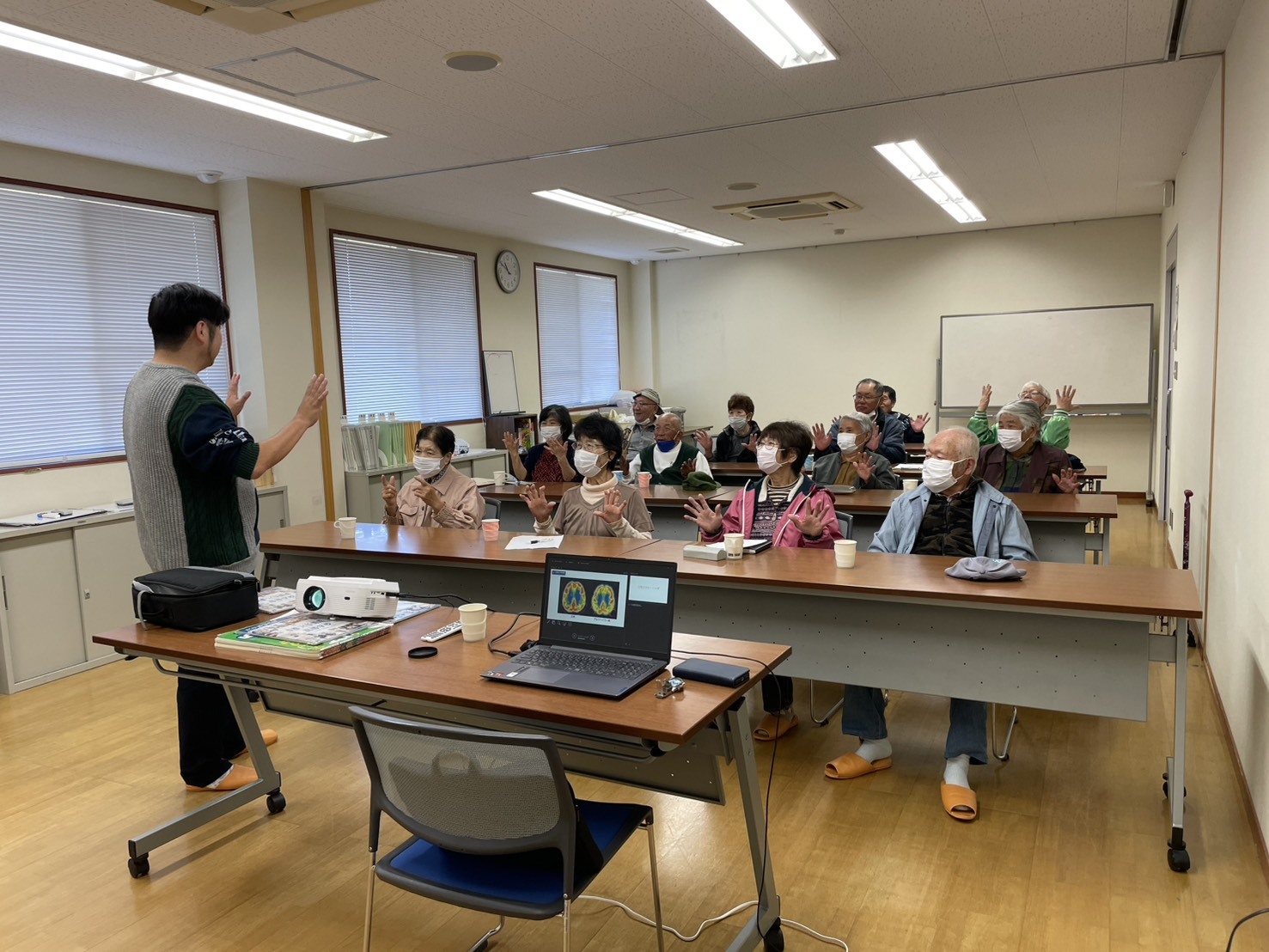 ミニ講座、ストレッチ、筋力トレーニングを組み合わせた90分の実践教室。笑い声が響くグループワークで脳と身体を同時に刺激し、筋力・認知機能スコアを測定して成果を数値で確認できます。